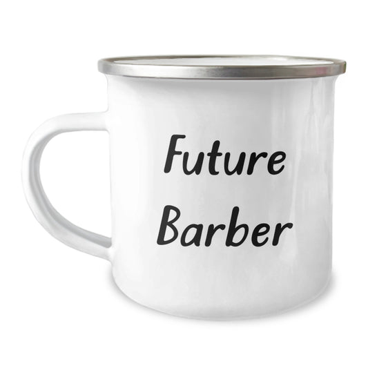 Funny Future Barber Gift from Friends for Graduation Unique Barber Camping Mug, 'The Future is Bright', 12 oz Stainless Steel Enamel Finish, Hand Wash Recommended, Permanent Printing