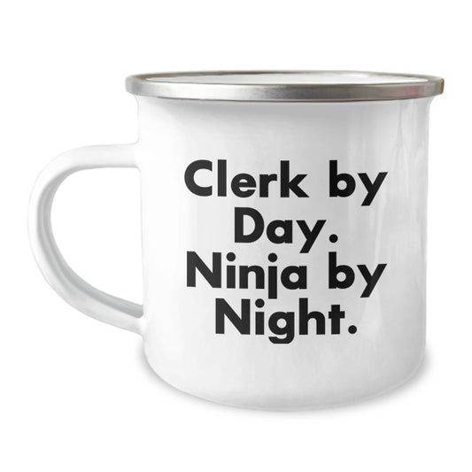 Clerk By Day, Ninja By Night, Funny Camping Mug for Clerk Gifts from Friends, Ideal for Men and Women Graduation Unique Gifts