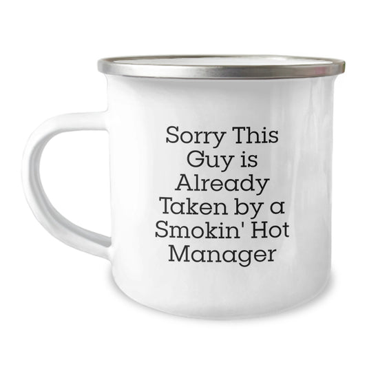 Funny Manager Gifts for Men, Christmas Unique Mugs for Camping Enthusiasts, 'Sorry This Guy Is Already Taken By A Smokin' Hot Manager'