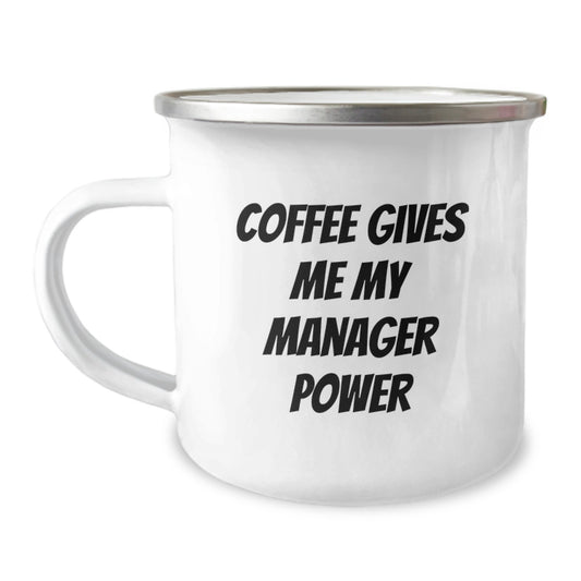 Funny Manager Gifts from Friends for Birthday - 'Coffee Gives Me My Manager Power' Camping Mug, 12 oz Stainless Steel with Enamel Finish