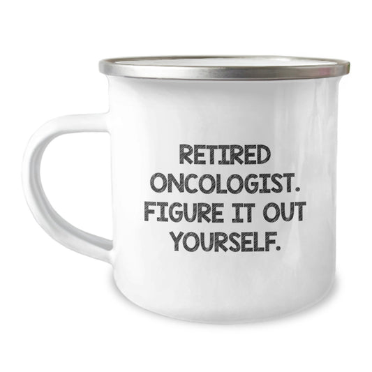 Oncologist Gifts Funny Quote Camping Mug, Gifts from Family for Birthday, 'Retired Oncologist. Figure It Out Yourself.'