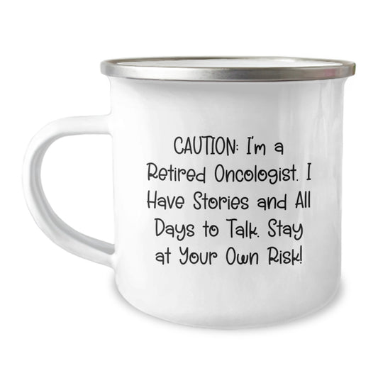 Funny Oncologist Gifts from Family for Men, 'I'm A Retired Oncologist. I Have Stories And All Days To Talk. Stay At Your Own Risk!' Camping Mug - 12 oz Stainless Steel Enamel Finish