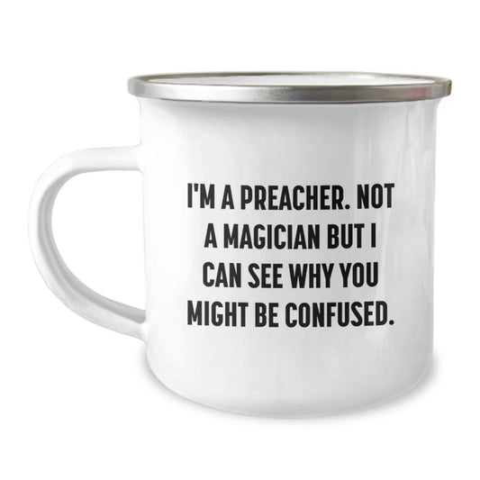 Funny Preacher Gifts from Friends for Preacher Graduation - I'm A Preacher. Not A Magician But I Can See Why You Might Be Confused. Camping Mug