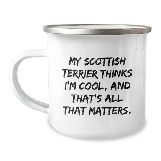 Funny Scottish Terrier Dog Gifts from Men to Friends - My Scottish Terrier Thinks I'm Cool Mug for Birthday with Scottish Terrier Dog Quote, Camping Mug