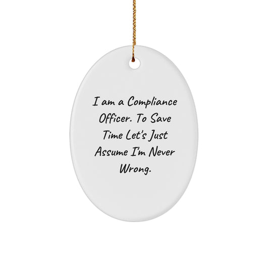 Funny Compliance Officer Gifts for Men, White Oval Ornament with 'I Am A Compliance Officer. To Save Time Let's Just Assume I'm Never Wrong.' Quote, Christmas Unique Presents from Friends