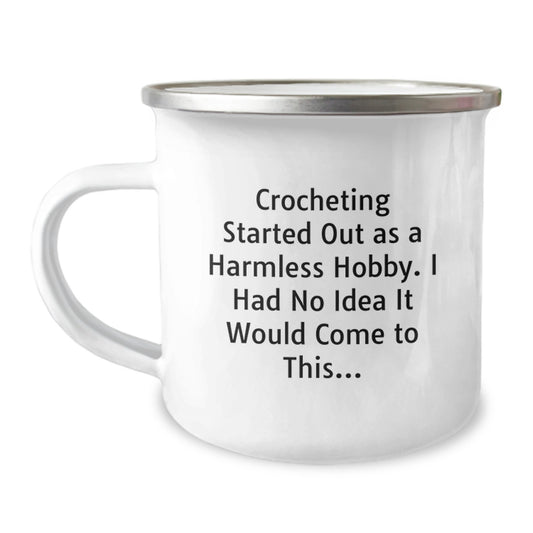 Funny Crocheting Gifts for Women Camping Mugs, 'Crocheting Started Out As A Harmless Hobby', Unique Christmas Unique Gifts from Mom to Friends