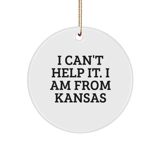 Kansas Circle Ornament, 'I Can't Help It. I Am From Kansas', Funny Quote, White, 2.75" Tall, Unique Gift for Friends, Family or Coworkers from Kansas