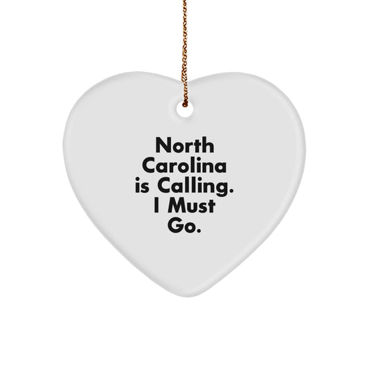 North Carolina Gifts for Men, Women, or Friends - 'North Carolina Is Calling. I Must Go.' Heart Ornament, White Heart Shaped, Perfect for Christmas