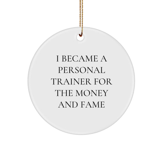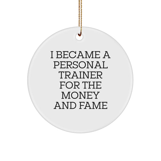 Funny Personal Trainer Gifts for Men, Women, Friends and Family - 'I Became A Personal Trainer For The Money And Fame' Christmas Ornament, Circle Shaped MDF, Durable and Lightweight