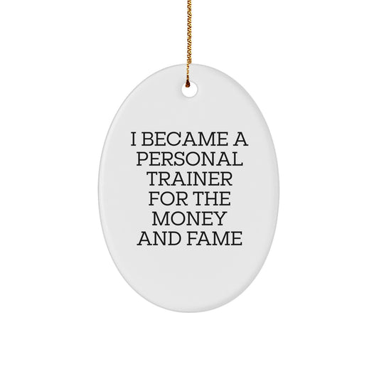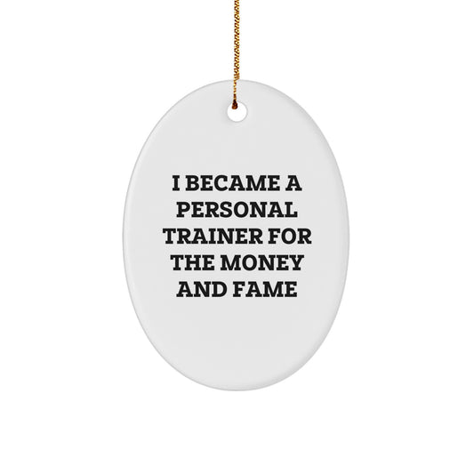 Funny Personal Trainer Christmas Unique Gifts for Friends or Family, Oval Ornament with I Became A Personal Trainer For The Money And Fame Quote, Gifts from Men or Women