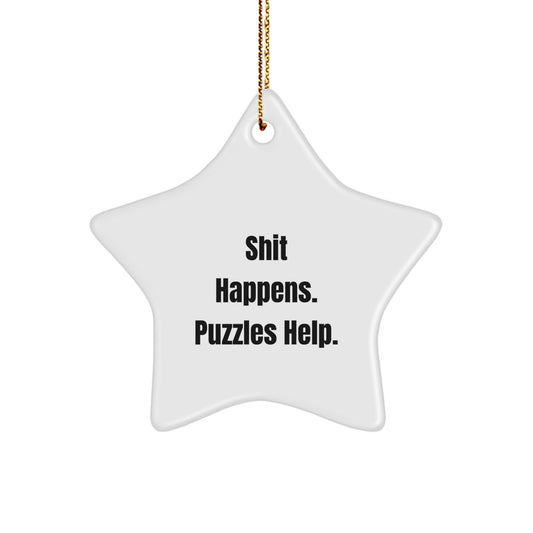 Funny Puzzles Gifts for Friends, Coworkers, or Family - 'Shit Happens. Puzzles Help.' Star Ornament, White, 3.25" tall, Christmas Unique Presents