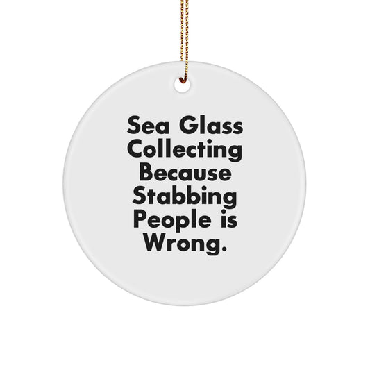 Sea Glass Collecting Gifts from Friends, Funny Circle Ornament for Men, Women, or Coworkers, Unique Christmas Decorations with 'Sea Glass Collecting Because Stabbing People Is Wrong.' Quote