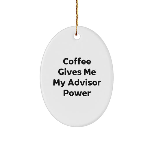 Funny Advisor Gifts from Friends for Christmas Oval Ornament, 'Coffee Gives Me My Advisor Power' Quote, White Oval Shaped with High-Gloss Finish