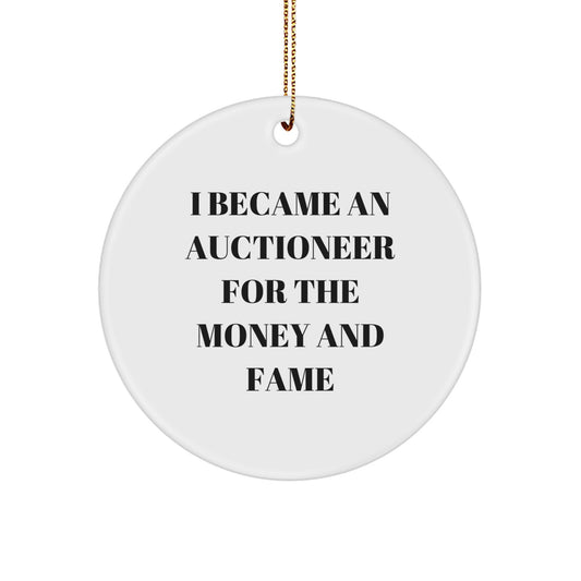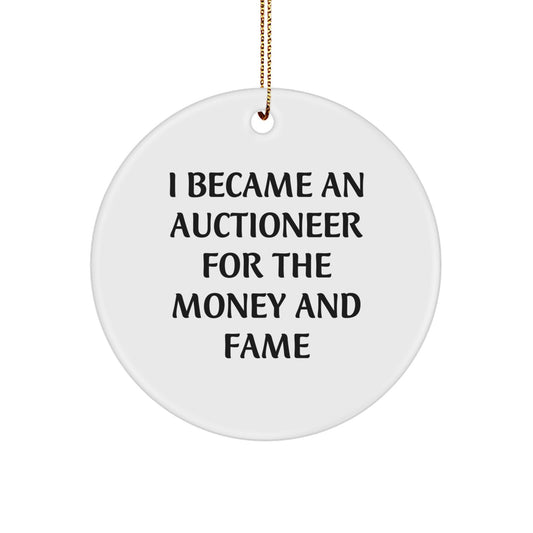 Funny Auctioneer Gifts from Friends, Auctioneer Christmas Unique Gifts for Men - 'I Became An Auctioneer For The Money And Fame' White Circle Ornament