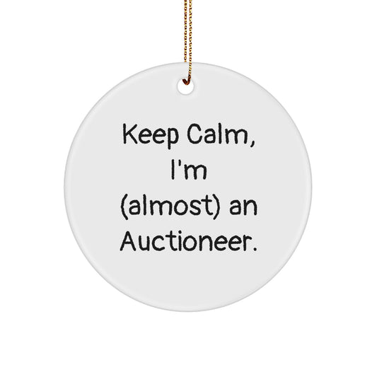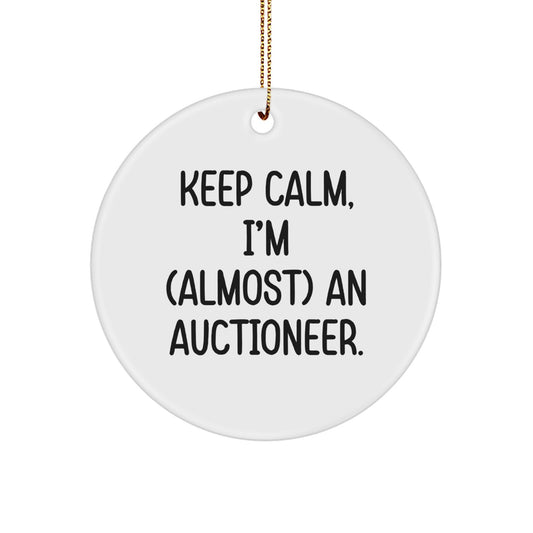 Auctioneer Gifts for Christmas - Funny Circle Ornament, 'Keep Calm I'm almost An Auctioneer', White Color, Durable MDF, High-Gloss Finish, Gold Cord