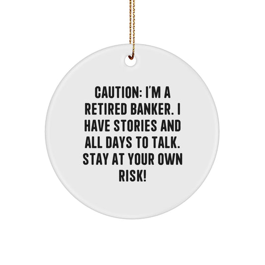 Banker's Warning: Funny Circle Ornament Gifts from Friends to Bankers, 'Caution: I'm A Retired Banker. I Have Stories And All Days To Talk. Stay At Your Own Risk!'
