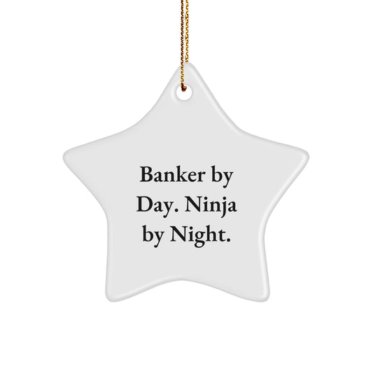 Banker Gifts from Men - Star Ornament for Banker By Day. Ninja By Night. - Funny Christmas Unique Gift for Banker, Star Shaped, 3.25 Tall, White, MDF, Sublimation, Gold Cord