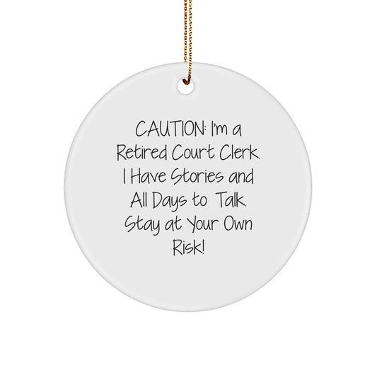 Funny Court Clerk Gifts: 'Caution: I'm A Retired Court Clerk...' Circle Ornament for Men, Women, Friends, Coworkers, and Family - Christmas Unique Gifts from Men, Women, Coworkers, and Family