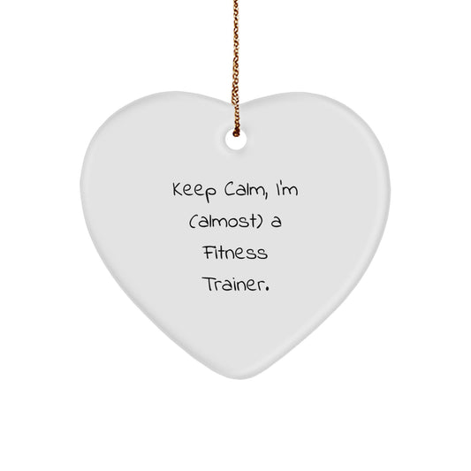 Funny Fitness Trainer Gift for Friends, Heart Ornament with 'Keep Calm, I'm (almost) A Fitness Trainer', Christmas Unique Gifts for Men, Women, Family, Coworkers, and Fitness Trainer Enthusiasts
