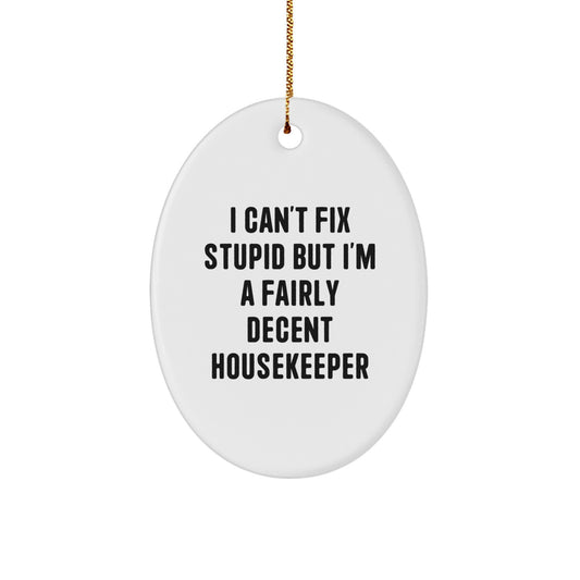 Funny Housekeeper Gifts from Friends for Christmas - Oval Ornament with 'I Can't Fix Stupid But I'm A Fairly Decent Housekeeper' Quote