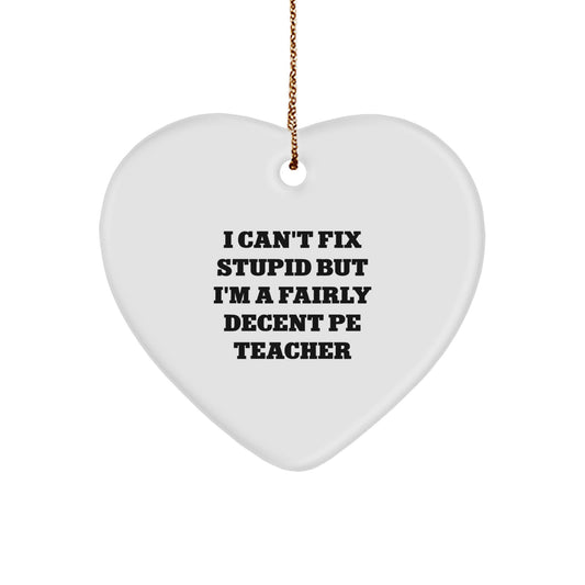 Funny PE Teacher Gifts from Friends - 'I Can't Fix Stupid But I'm A Fairly Decent PE Teacher' Heart Ornament for Christmas, Gifts for PE Teachers, Men, Women, Friends, Coworkers, Family