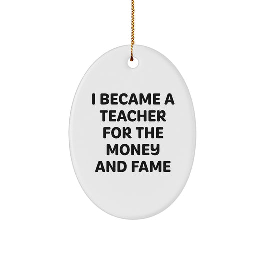 Funny Teacher Gifts for Men or Women, Oval Ornament, I Became A Teacher For The Money And Fame, Christmas Unique Presents