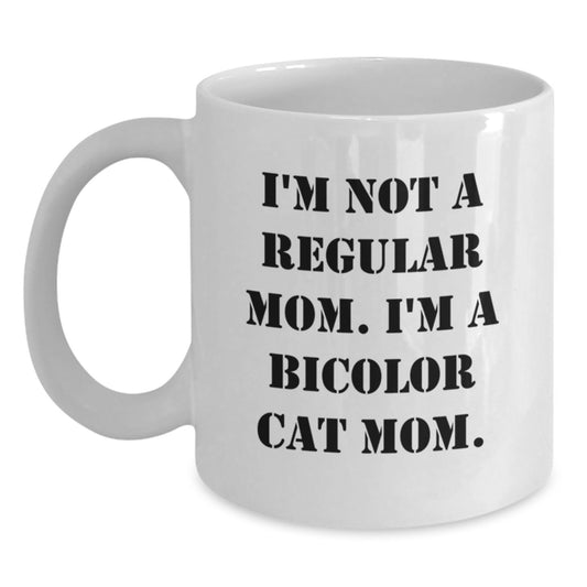 Funny Bicolor Cat Mom White Coffee Mugs for Graduation Gifts from Friends and Family, Unique I'm Not A Regular Mom. I'm A Bicolor Cat Mom. Quote for Bicolor Cat Lovers, 11oz or 15oz Capacity