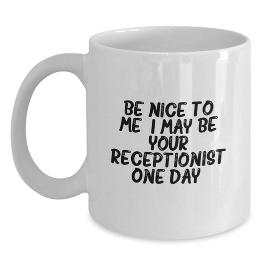 Funny White Coffee Mug Gifts for Receptionists from Coworkers - Be Nice To Me. I May Be Your Receptionist One Day. Unique Christmas Unique Gifts for Women