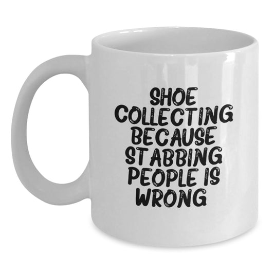 Funny Shoe Collecting Gifts for Friends and Family - 'Stabbing People Is Wrong' White Coffee Mug, Unique Christmas Mugs for Men and Women