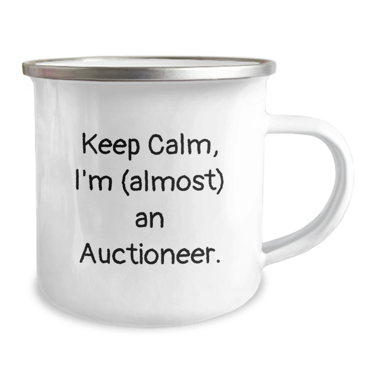 - This funny 'Keep Calm, I'm (almost) An Auctioneer.' Camping Mug is a great way to show your appreciation for the Auctioneers in your life. With its unique design and humor, it's a ideal gift for Auctioneer friends or family members. The stainless steel and enamel finish ensure that this mug is both functional and stylish.