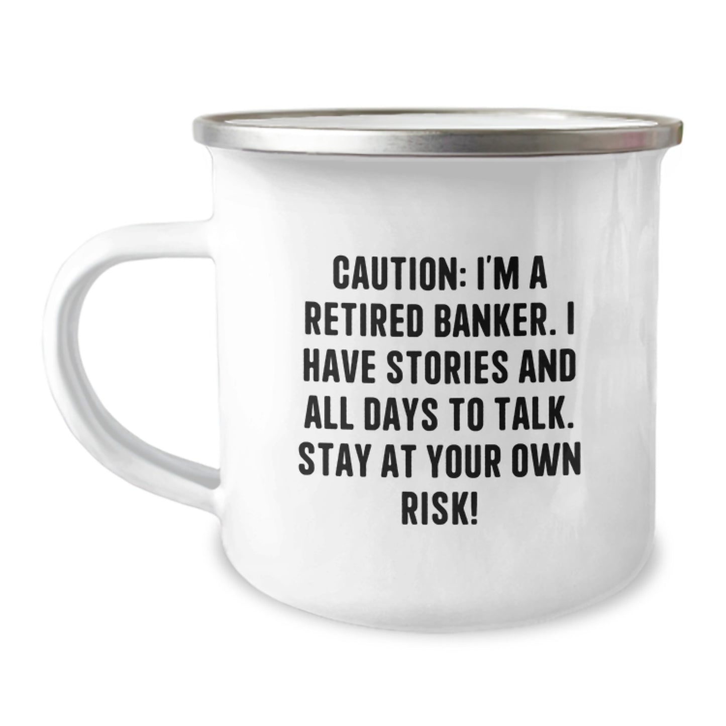 - As a retired 'Caution: I'm A Retired Banker. I Have Stories And All Days To Talk. Stay At Your Own Risk!'', this camping mug is the perfect companion for your outdoor adventures. With its 12 oz capacity, stainless steel with enamel finish, and permanent printing, you can enjoy your favorite hot or cold beverage while reminiscing about your banking days.