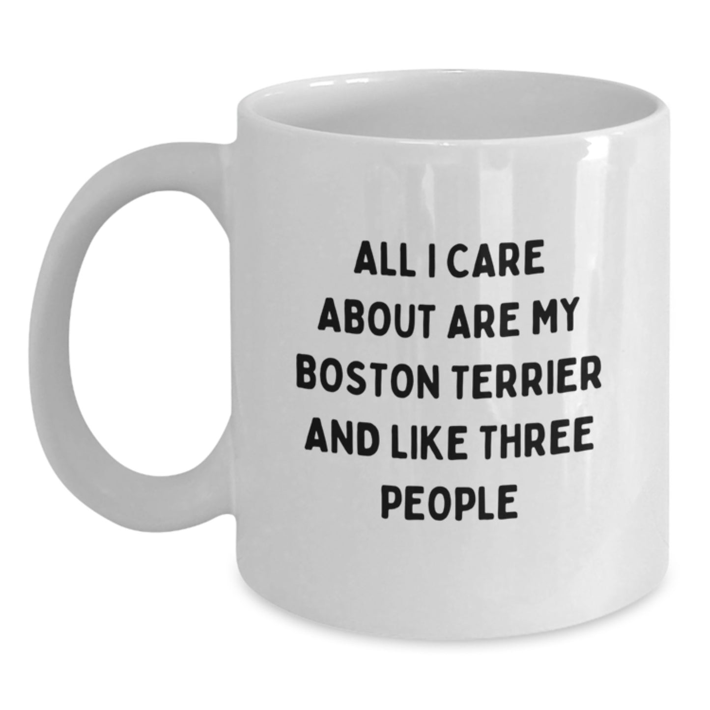 Boston Terrier Dog enthusiasts, rejoice! This hilarious coffee mug is the ideal gift for your beloved furry friend's birthday. The quote 'All I Care About Are My Boston Terrier And Like Three People' is sure to bring a smile to their face. Made from ceramic, this 11oz or 15oz white coffee mug is microwave and dishwasher safe, making it easy to clean and use. Whether you're a dog parent or just a dog lover, this unique gift is sure to delight. So, go ahead and gift it to your favorite Boston Terrier Dog owner on their special day.