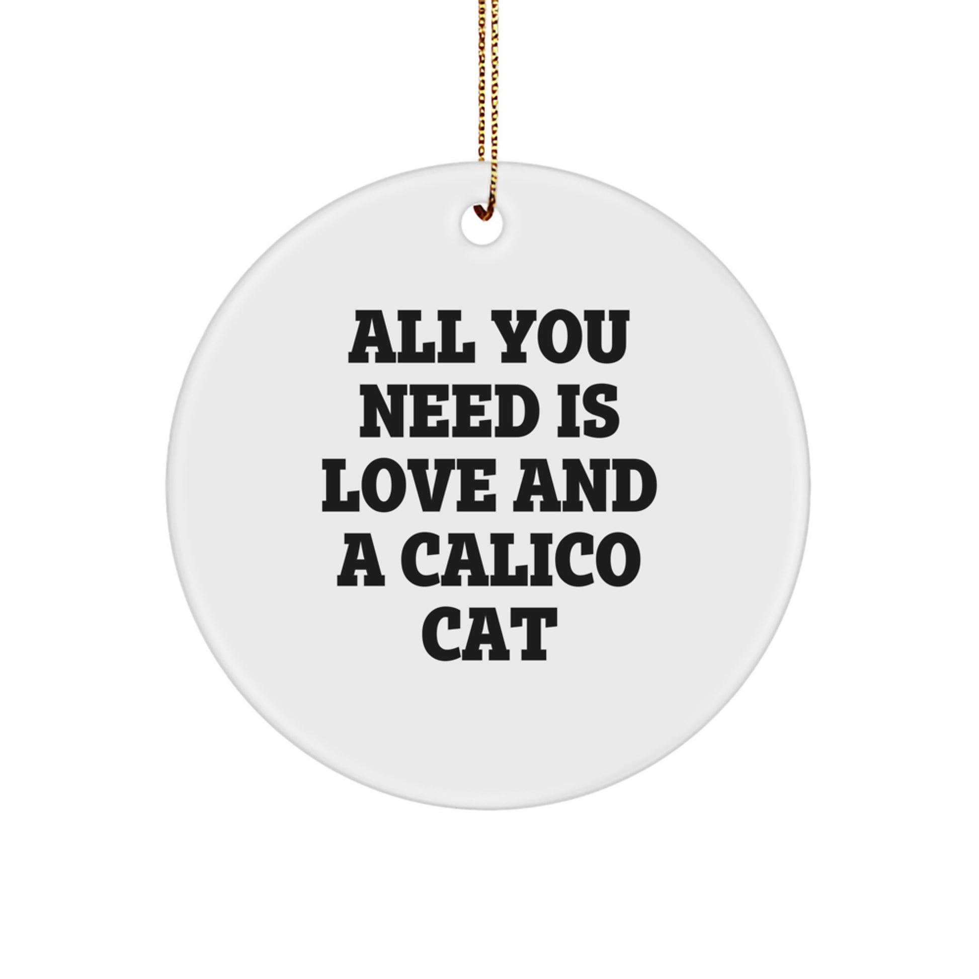 - Bring a touch of love and joy to your Christmas decorations with this 'All You Need Is Love And A Calico Cat' Circle Ornament, featuring a beautiful calico cat design on a white circle, measuring 2.75″ tall, 1/8″ thick, and 0.5 oz, made from durable MDF with a high-gloss plastic finish for long-lasting designs.