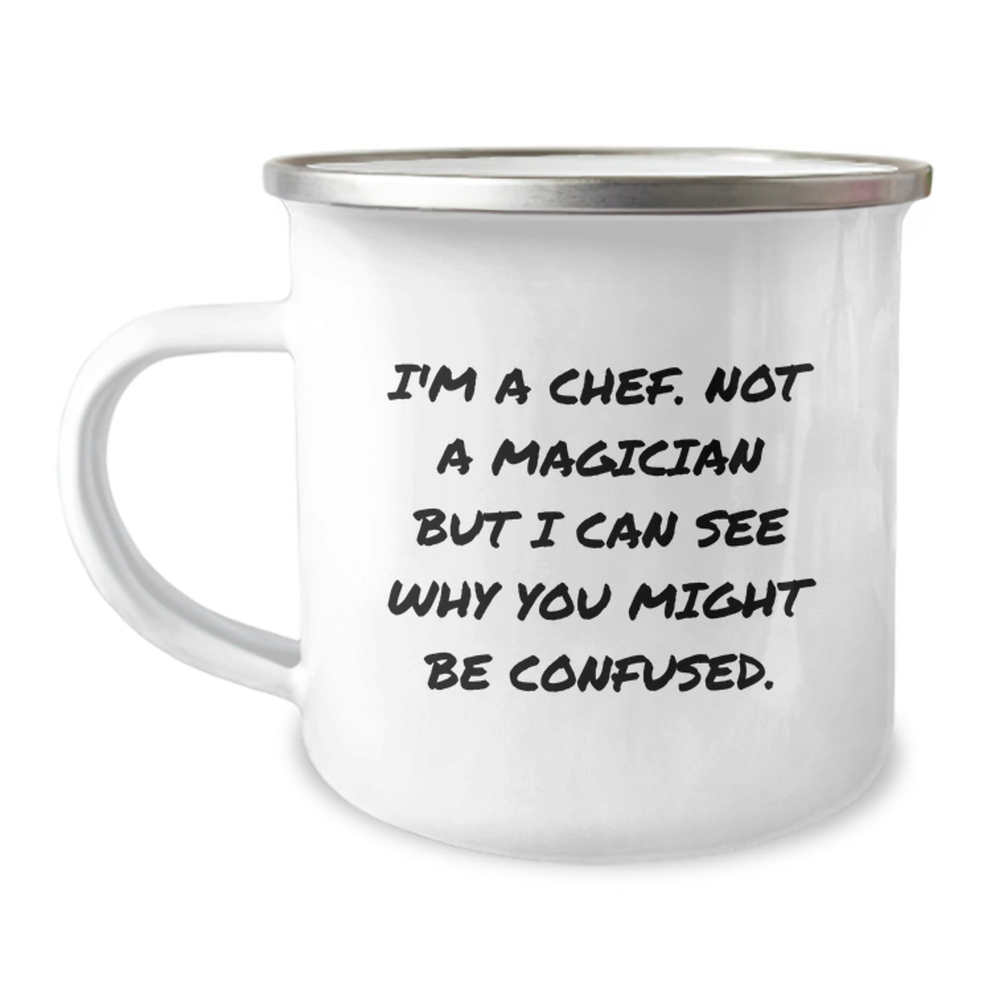 Are you a chef enthusiast or looking for a unique gift for a chef in your life? This funny quote camping mug is the perfect choice! With its stainless steel construction and enamel finish, it's a sturdy and stylish addition to any kitchen. The quote 'I'm A Chef. Not A Magician But I Can See Why You Might Be Confused.' is a hilarious and relatable statement that any chef would love. Whether you're a chef yourself or just appreciate their hard work, this gift is sure to bring a smile to their face. It's also a great addition to any camping trip or outdoor adventure. So why wait? Send this thoughtful gift to your friends, family, or coworkers who appreciate the culinary arts. You can't go wrong with this unique and functional present.