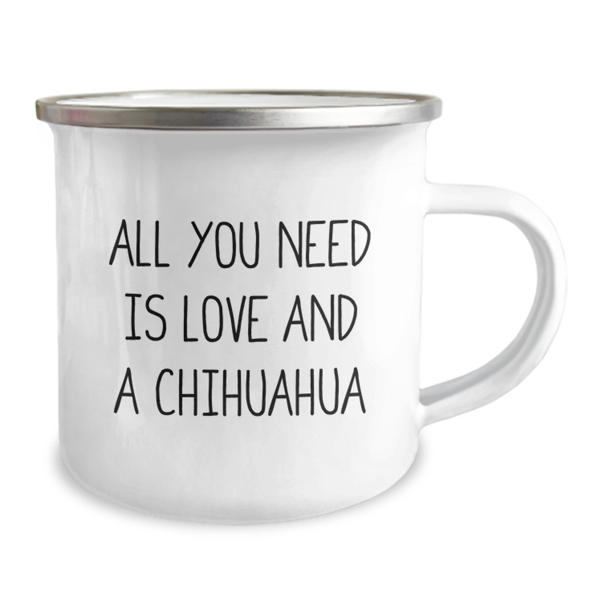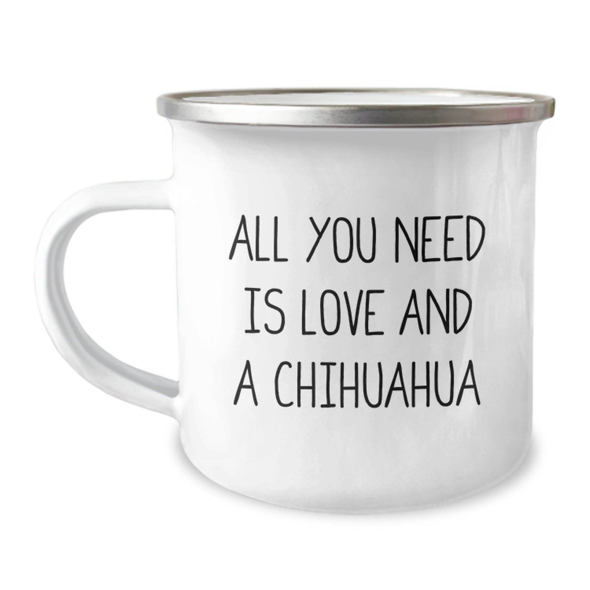 Are you a Chihuahua Dog enthusiast or looking for a unique gift for the Chihuahua Dog lover in your life? Look no further! This hilarious 'All You Need is Love and a Chihuahua' Camping Mug is the perfect way to show your love and appreciation for these adorable furry friends. Whether you're celebrating a graduation or just want to brighten up someone's day, this thoughtful gift is sure to bring a smile to their face. Made from sturdy stainless steel with an enamel finish, this 12 oz capacity mug is perfect for hot or cold beverages. And with its permanent printing, the design won't fade after washing. So go ahead, get your paws on this amazing gift and spread some love and laughter!