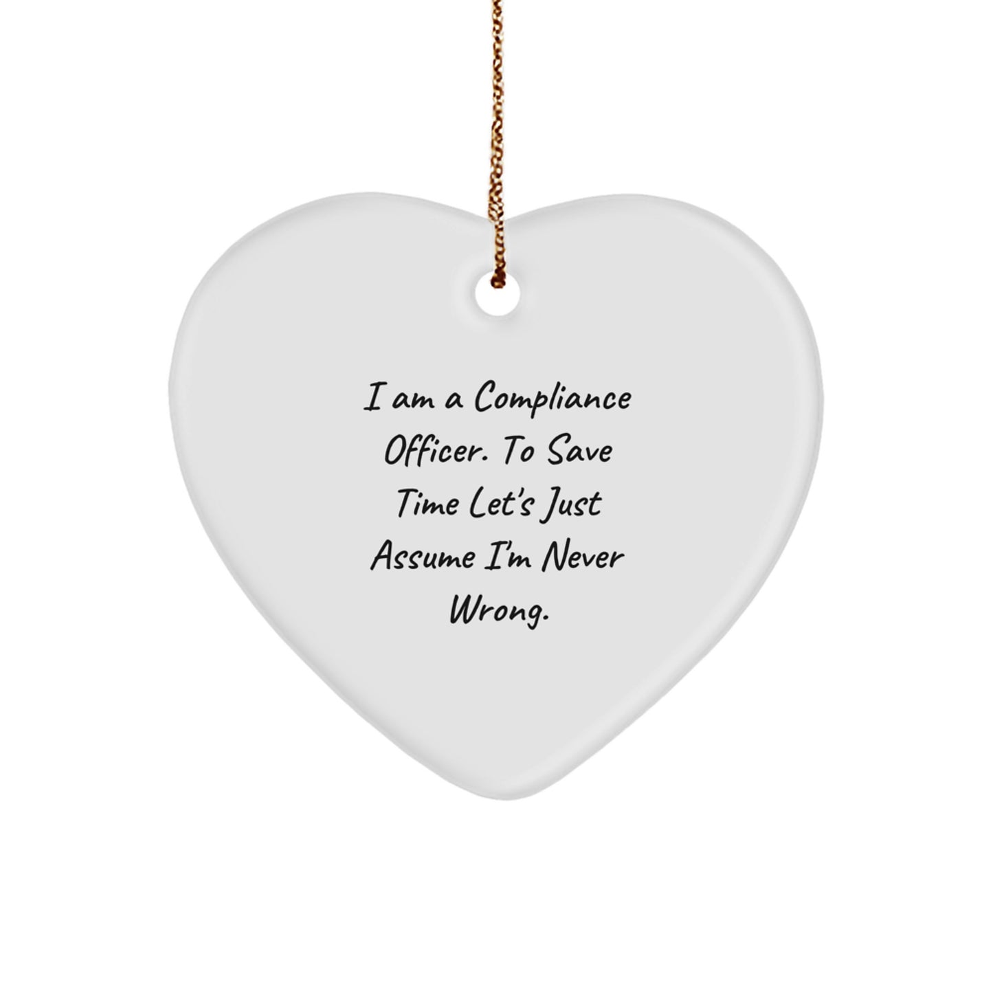 Are you struggling to find the ideal gift for the Compliance Officer in your life? Look no further! This Heart Ornament is a unique and thoughtful present that shows you care. With its funny quote, 'I Am A Compliance Officer. To Save Time Let's Just Assume I'm Never Wrong.', it's sure to bring a smile to their face.