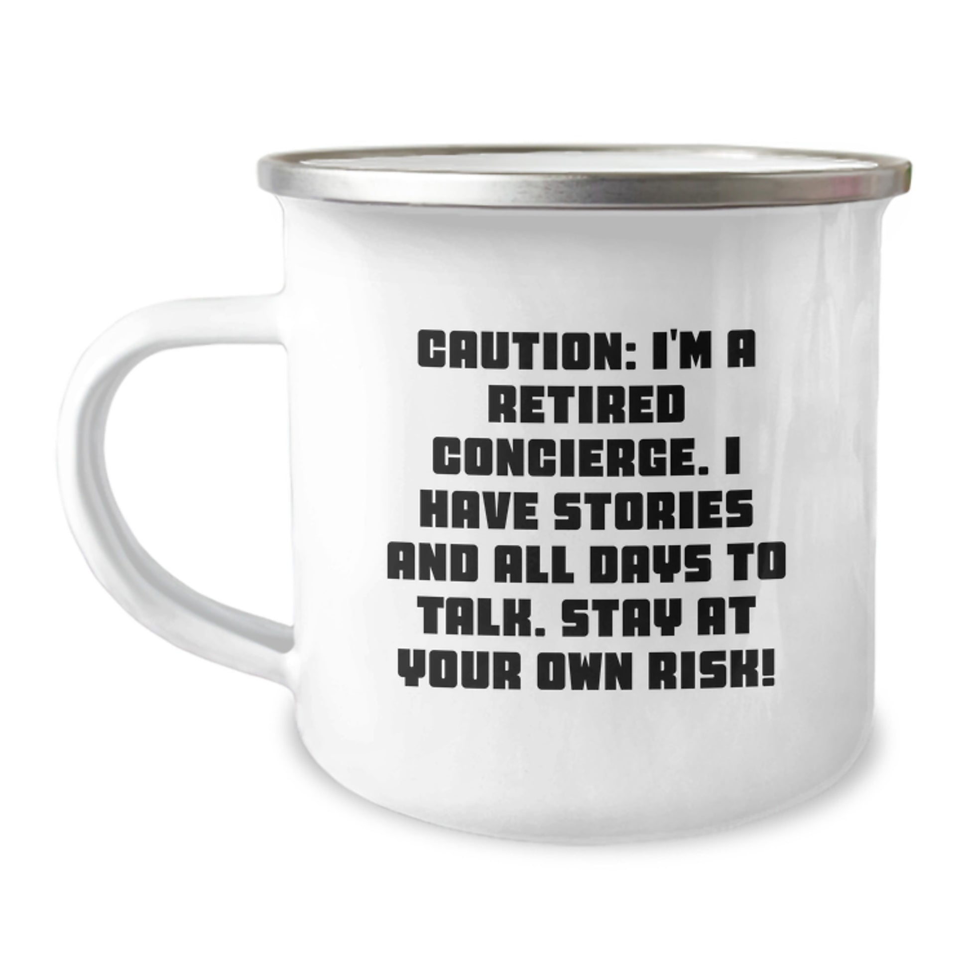 - This funny Concierge camping mug is a great way to express your love for the Concierge profession and your passion for camping. The quote 'Caution: I'm A Retired Concierge. I Have Stories And All Days To Talk. Stay At Your Own Risk!' is a humorous take on the Concierge profession and is sure to bring a smile to anyone's face. Whether you're a seasoned camping or just starting out, this camping mug is a great addition to your gear.