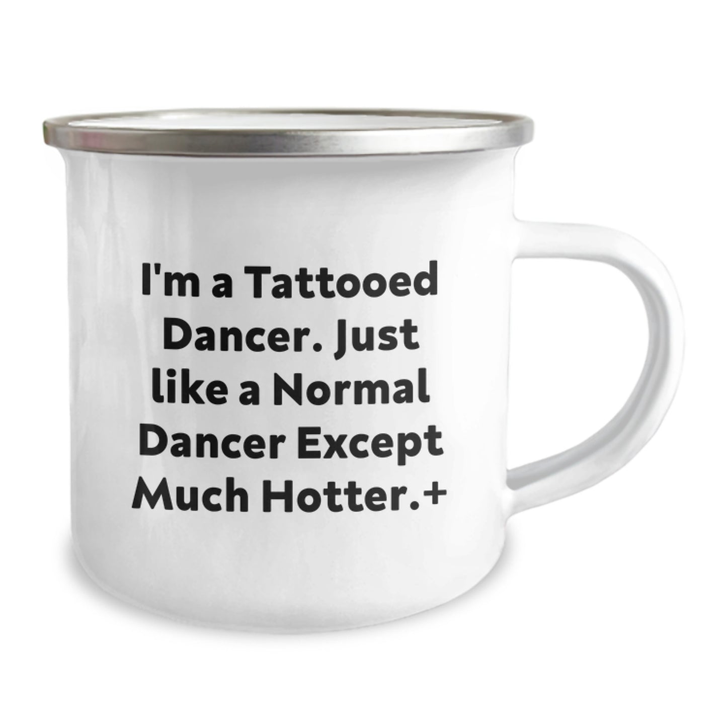 - Our 'I'm A Tattooed Dancer... Much Hotter' Camping Mug is a great way to show off your love for dance. The humorous quote is a lighthearted take on the classic 'normal dancer' joke. Whether you're a seasoned Dancer or just a fan, this mug is a great way to express your enthusiasm and personality. So why wait? Order your Dancer Camping Mug today!
