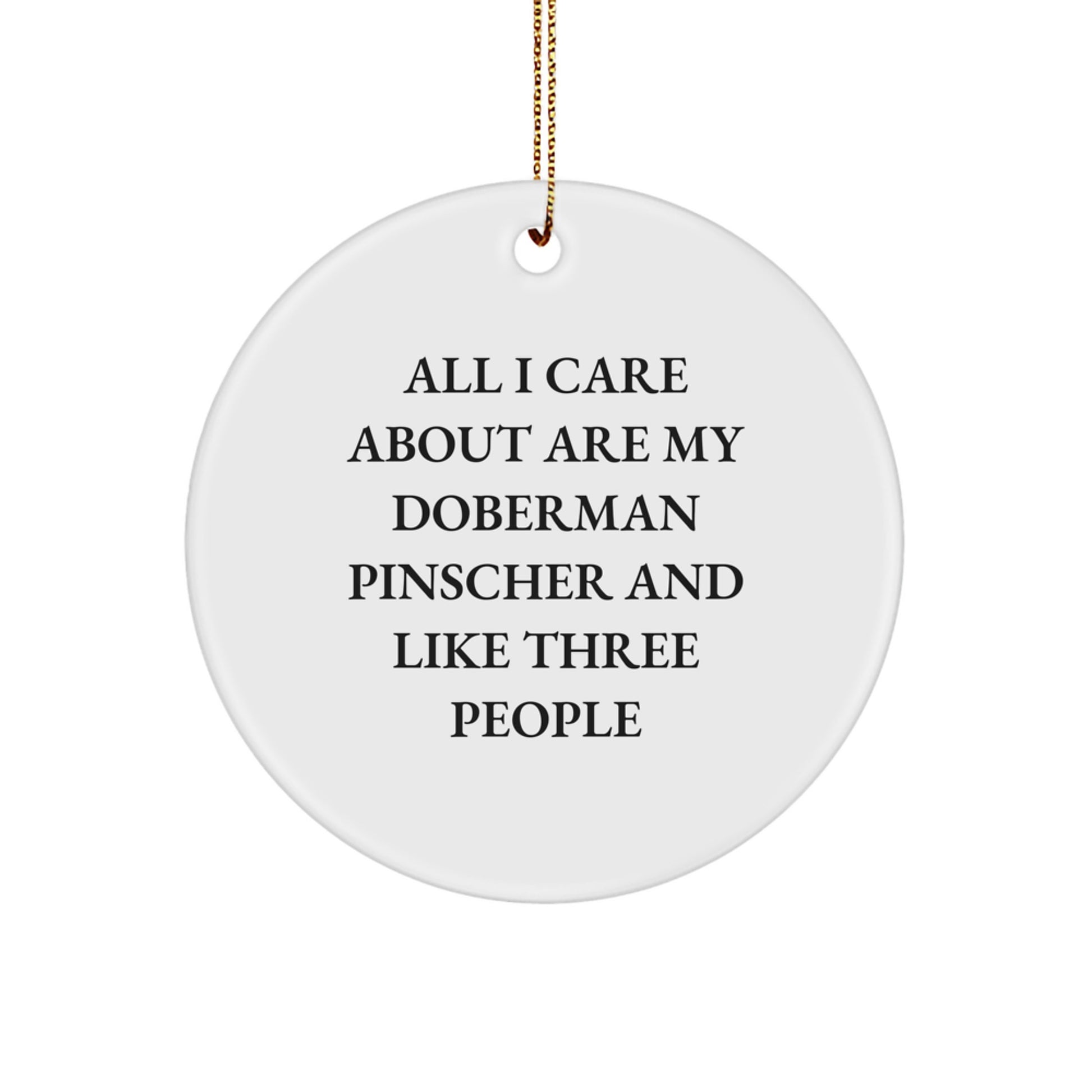 Whether you're a dog parent or a dog lover, this ornament is sure to bring a smile to your face. The quote 'All I Care About Are My Doberman Pinscher And Like Three People' is a hilarious and relatable sentiment that any dog owner can identify with. The ornament is vibrantly printed from edge-to-edge via Sublimation, ensuring bright, vivid colors that will stand out on your Christmas tree or any other decorative surface.
