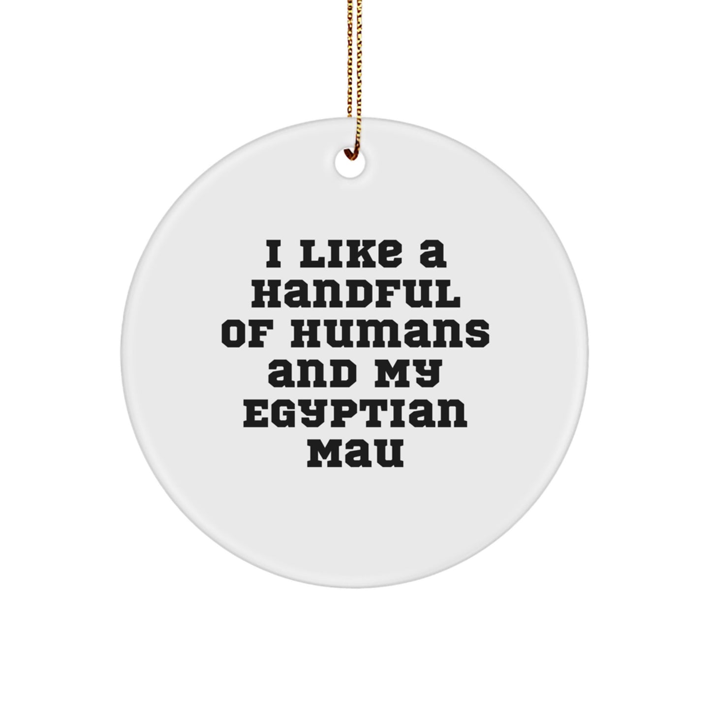 - Show your love and appreciation for the Egyptian Mau Cat in your life with our unique Christmas Circle Ornament. Made from sturdy MDF with a high-gloss plastic finish, this ornament is lightweight, resistant to breaking, and perfect for households with children or pets. The vibrant, edge-to-edge print of a funny quote, 'I Like A Handful Of Humans And My Egyptian Mau', will ensure that the colors remain bright and vivid, even with repeated use.