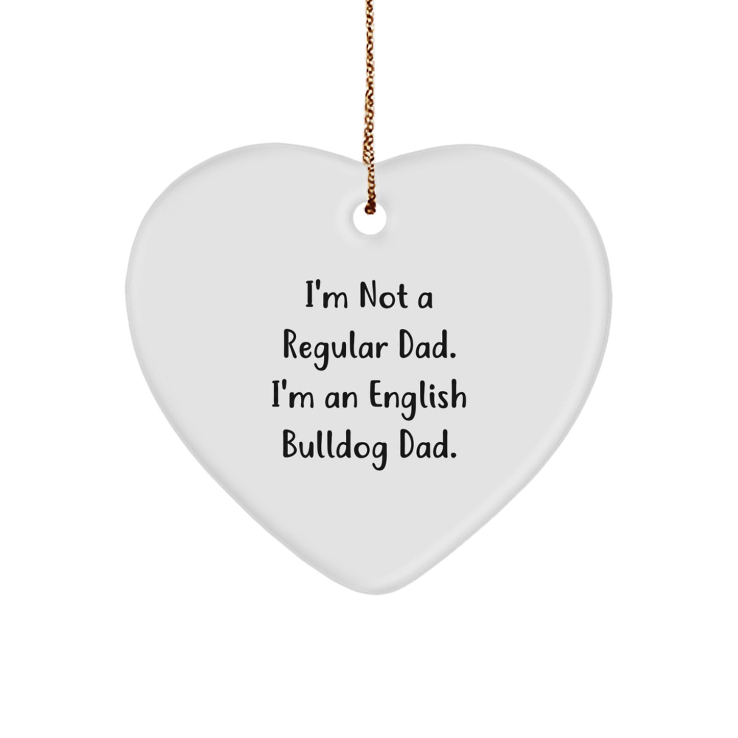 - This heart-shaped ornament is a unique and thoughtful gift for any English Bulldog lover, making it perfect for Christmas or any other occasion. The funny quote 'I'm Not A Regular Dad. I'm An English Bulldog Dad.' adds a touch of humor and personality to the design.