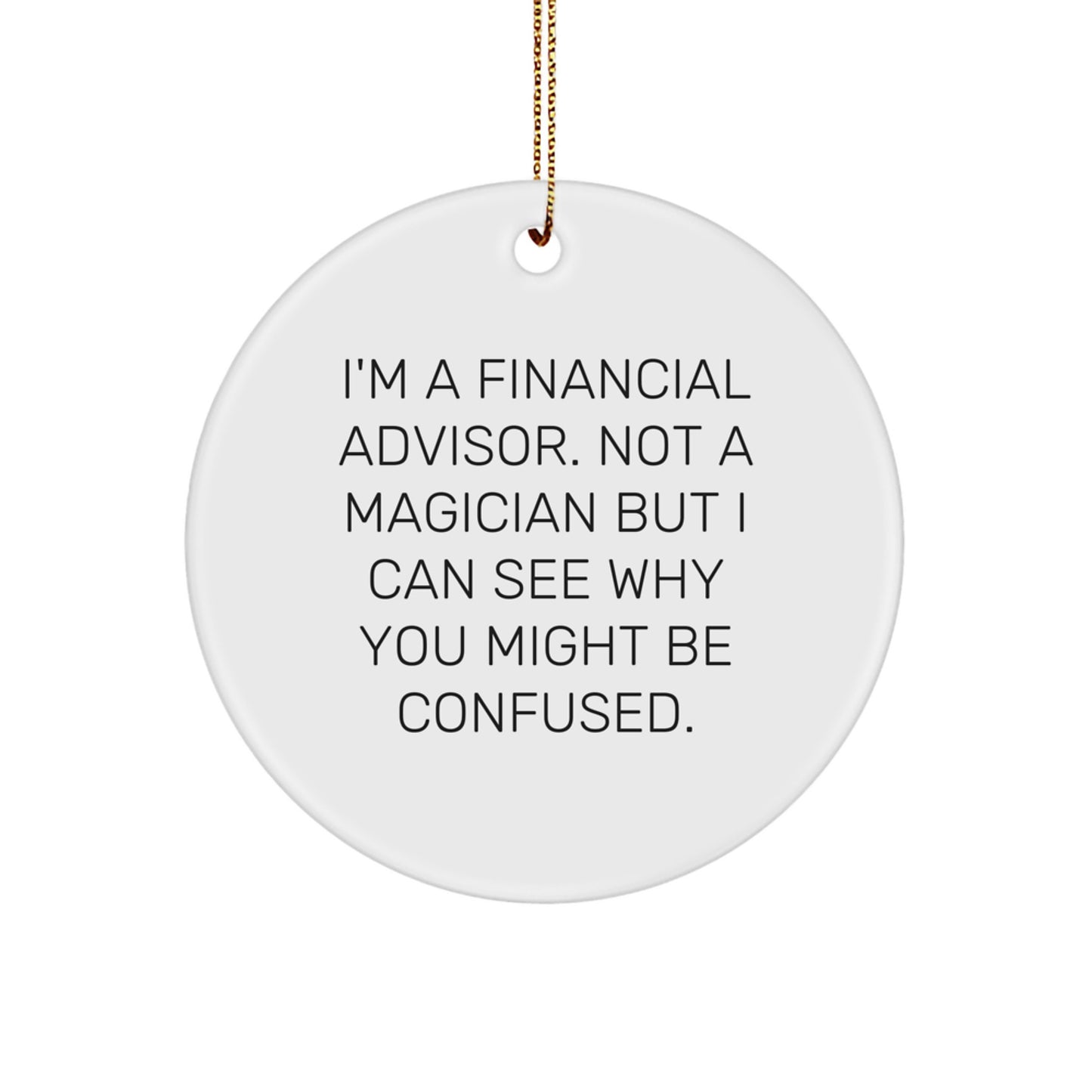 - Add a touch of humor to your Christmas tree with this funny circle ornament featuring the quote 'I'm A Financial Advisor. Not A Magician But I Can See Why You Might Be Confused.'