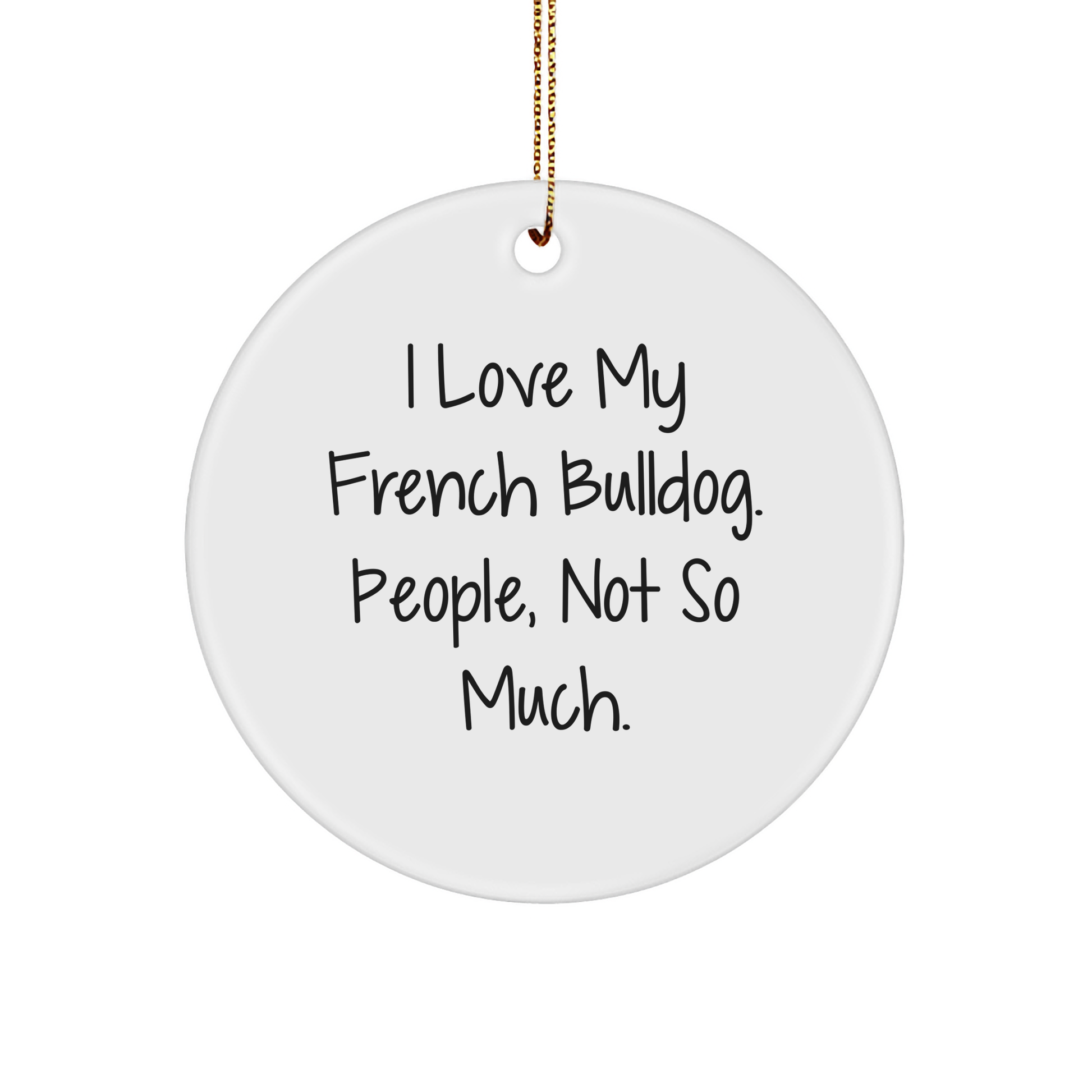 - 'I Love My French Bulldog. People, Not So Much.' Make a statement with this unique Circle Ornament featuring a French Bulldog design. Perfect for French Bulldog lovers who appreciate their quirky companion. (200-250 characters)