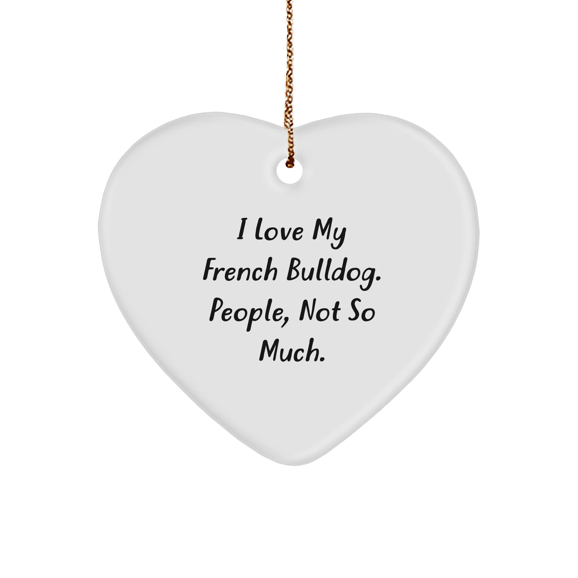 - This heart ornament is a thoughtful gift for any French Bulldog enthusiast, and its festive gold cord makes it easy to hang on your tree or in a window.