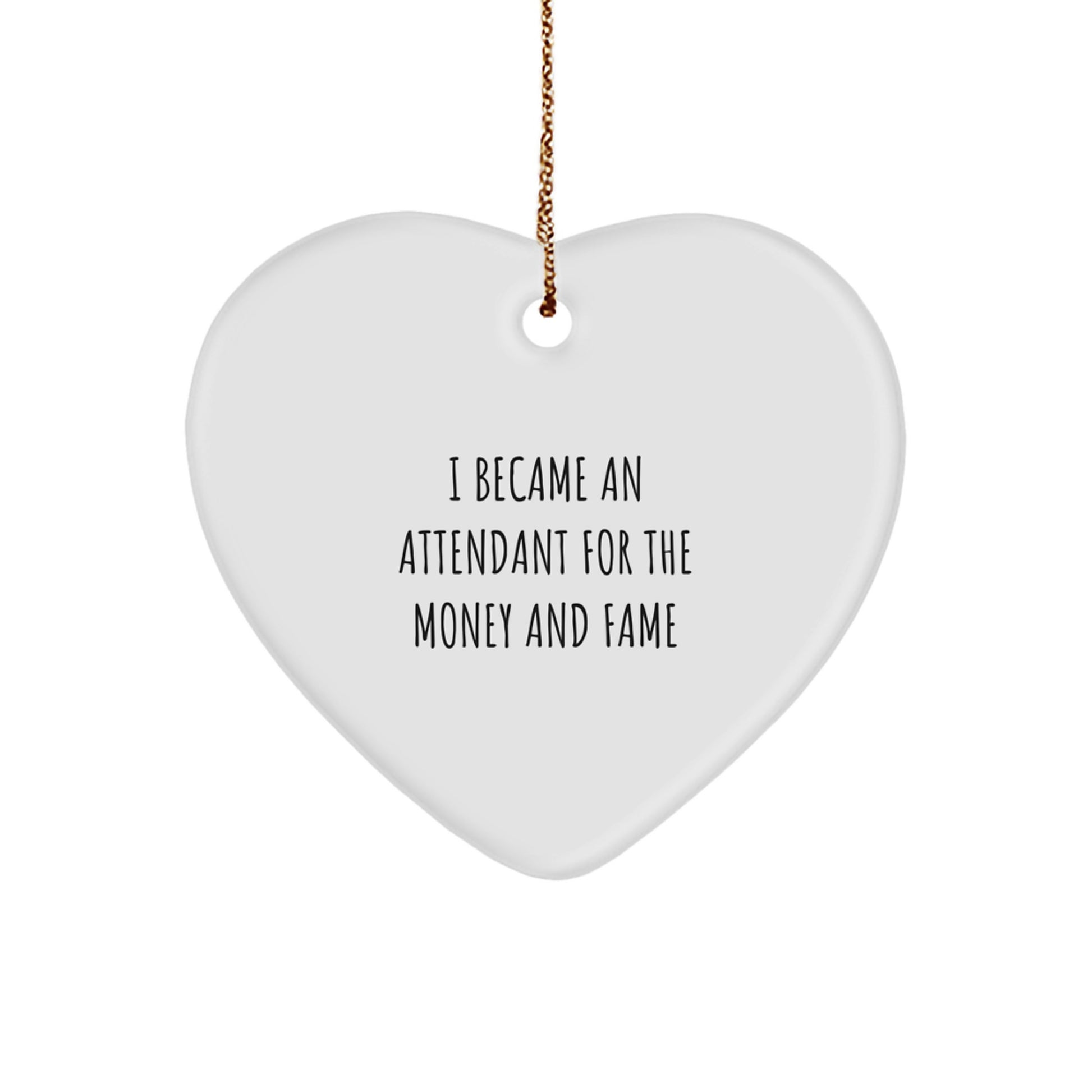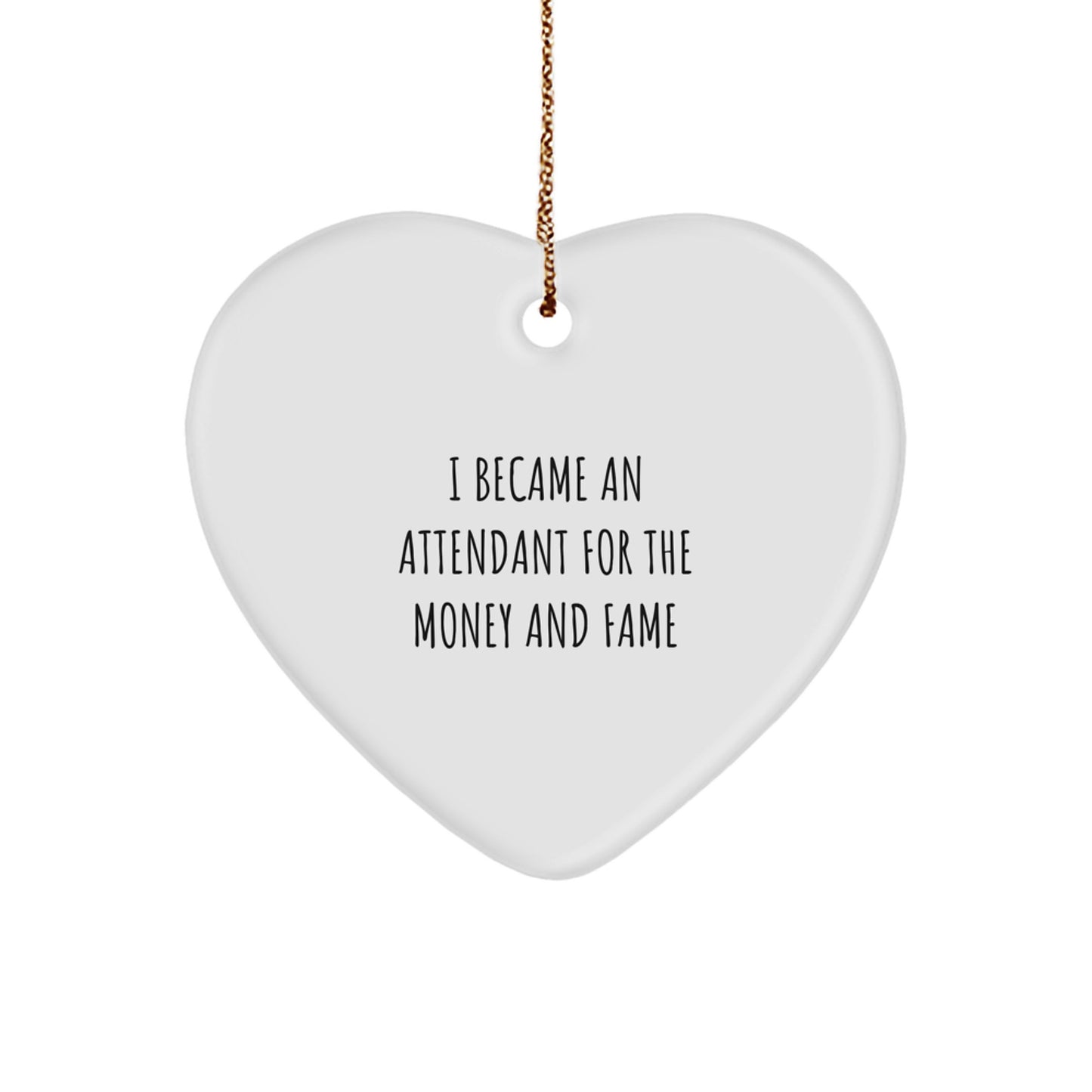 - Make a funny and thoughtful gift for Attendant enthusiasts with our Heart Ornament featuring the quote 'I Became An Attendant For The Money And Fame'. This unique decoration is perfect for any occasion, especially Christmas, and will be treasured for years to come. Our Heart Ornament is made from sturdy MDF with a high-gloss plastic finish, ensuring bright, vivid colors that will last for a long time.