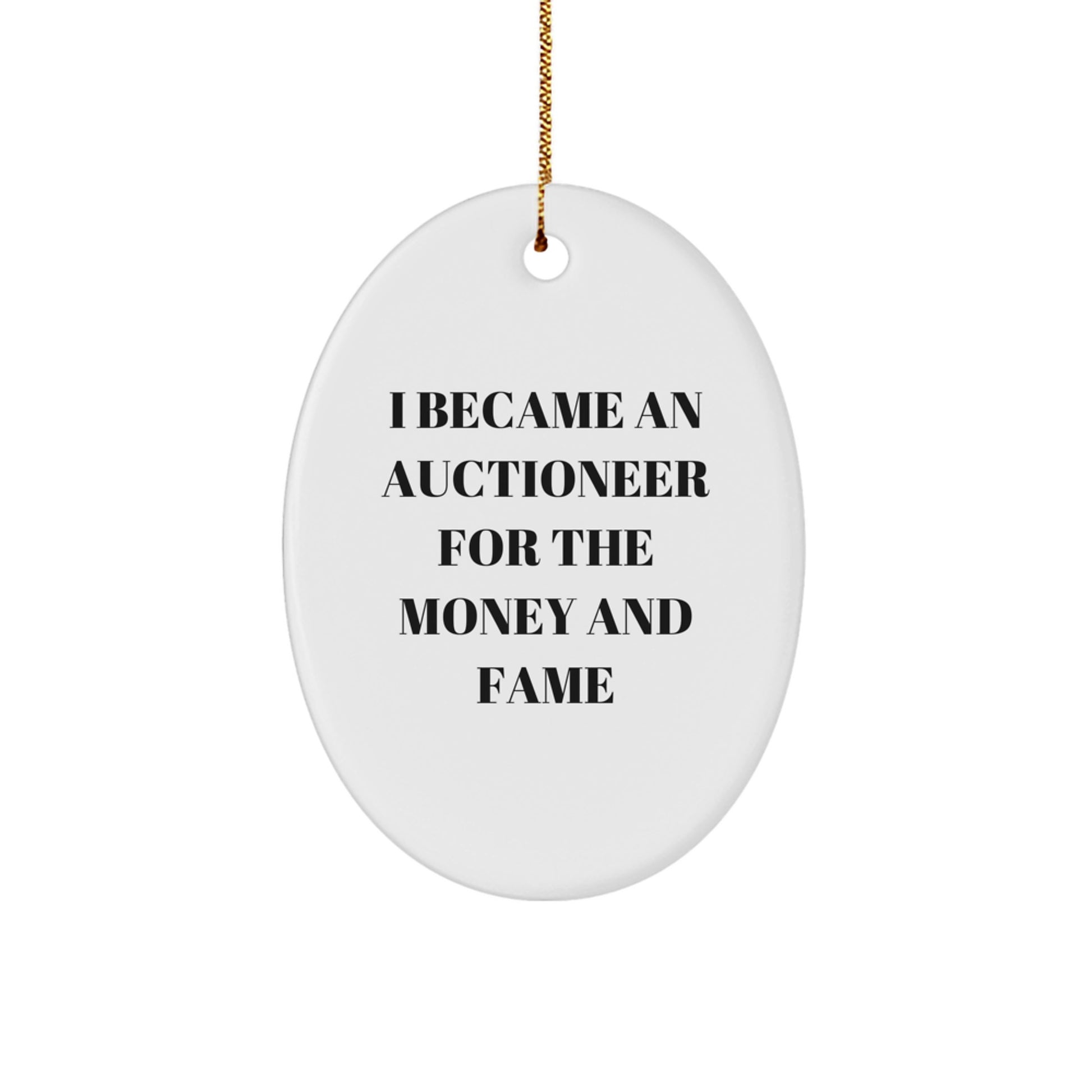 - This oval ornament is a unique and thoughtful gift for anyone who loves auctions or is an auctioneer themselves. It's a great way to add some humor and personality to your holiday decorations, and the quote 'I Became An Auctioneer For The Money And Fame' is the perfect message for anyone who has achieved their goals through hard work and determination.