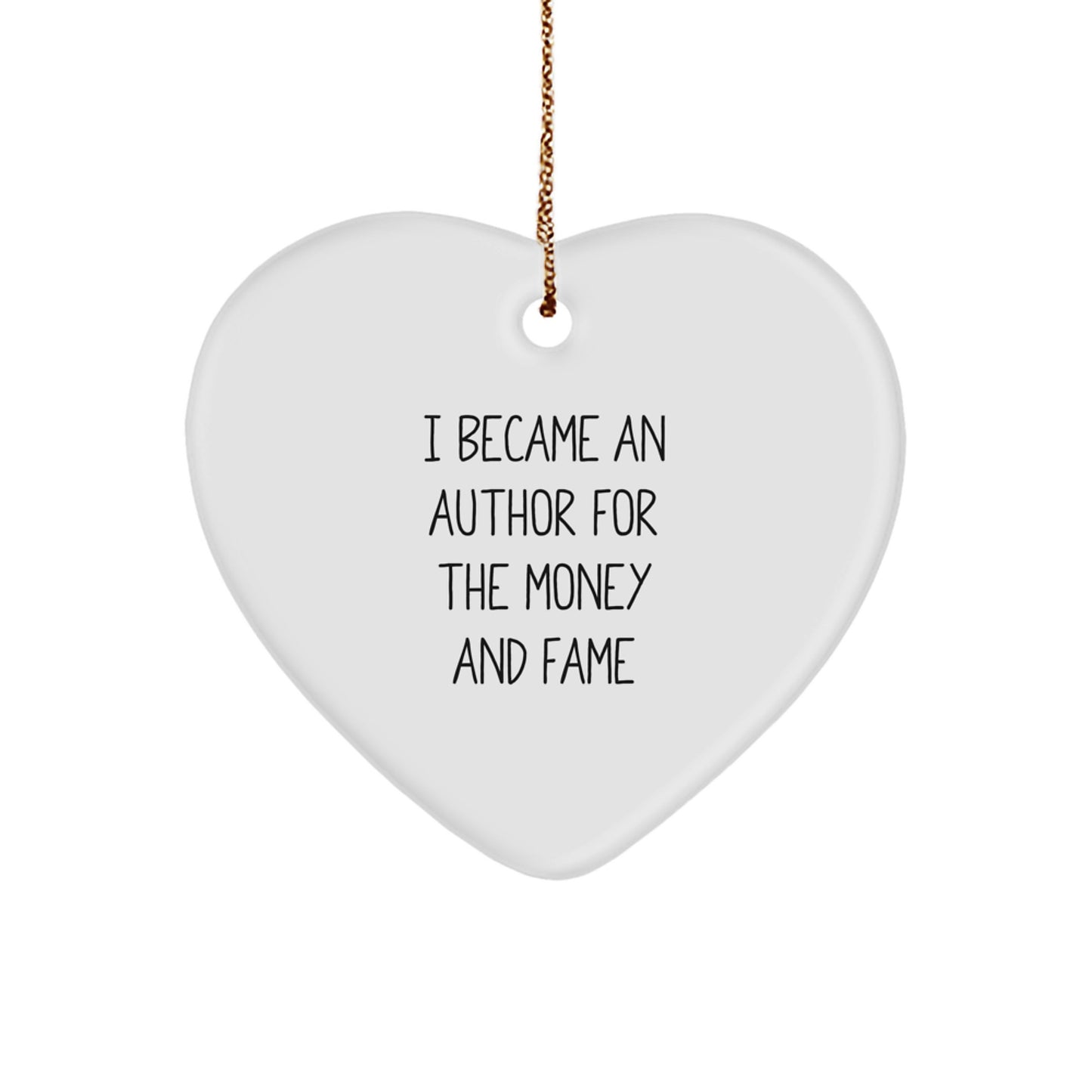 - This heart ornament is the perfect way to celebrate the authors in your life. Whether you're a fan of fiction or non-fiction, this gift is sure to be a hit. The quote 'I Became An Author For The Money And Fame' is both funny and relatable, making it the perfect way to show your appreciation for their work.