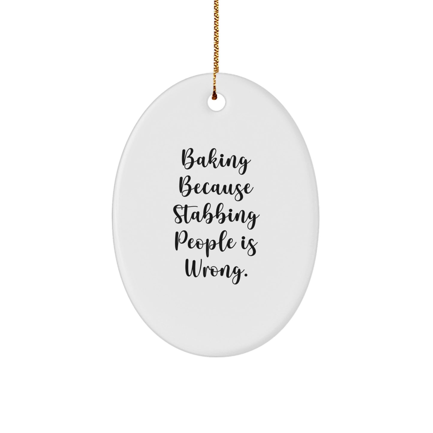 - Experience the joy of 'Baking Because Stabbing People Is Wrong.' with our delightful Oval Ornament, crafted from durable MDF with a high-gloss plastic finish for long-lasting designs, perfect for a sweet baking theme Christmas decoration.