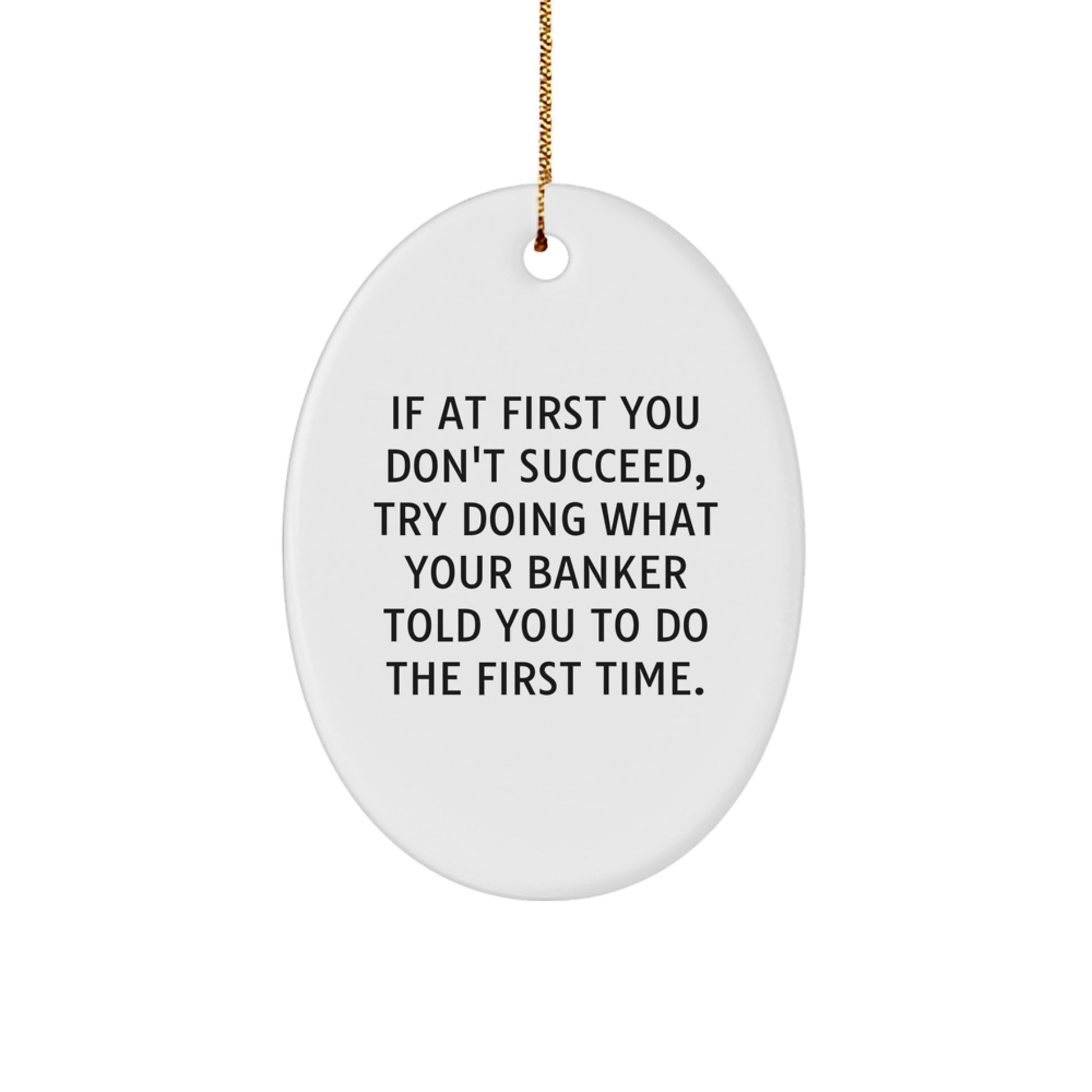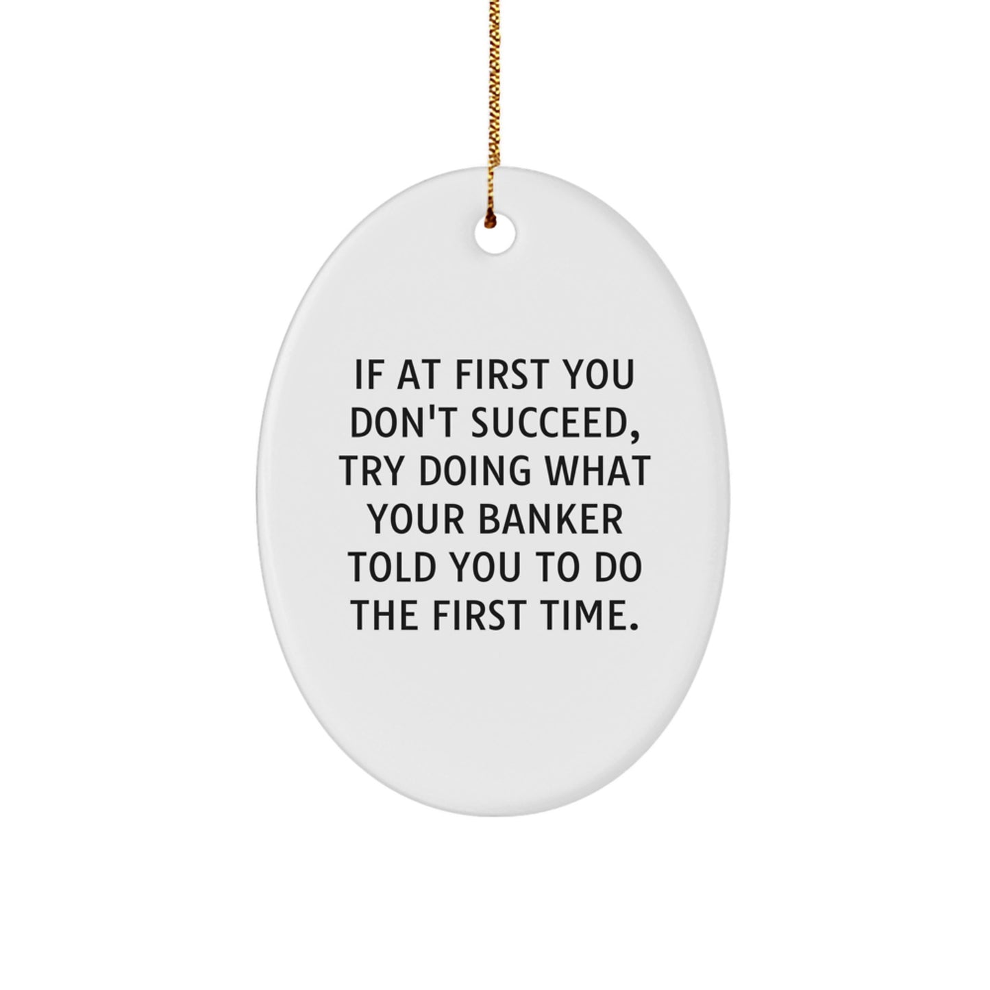 - The quote 'If At First You Don't Succeed, Try Doing What Your Banker Told You To Do The First Time.' is a humorous take on the banking industry, and the Oval Ornament is a unique way to display your sense of humor.