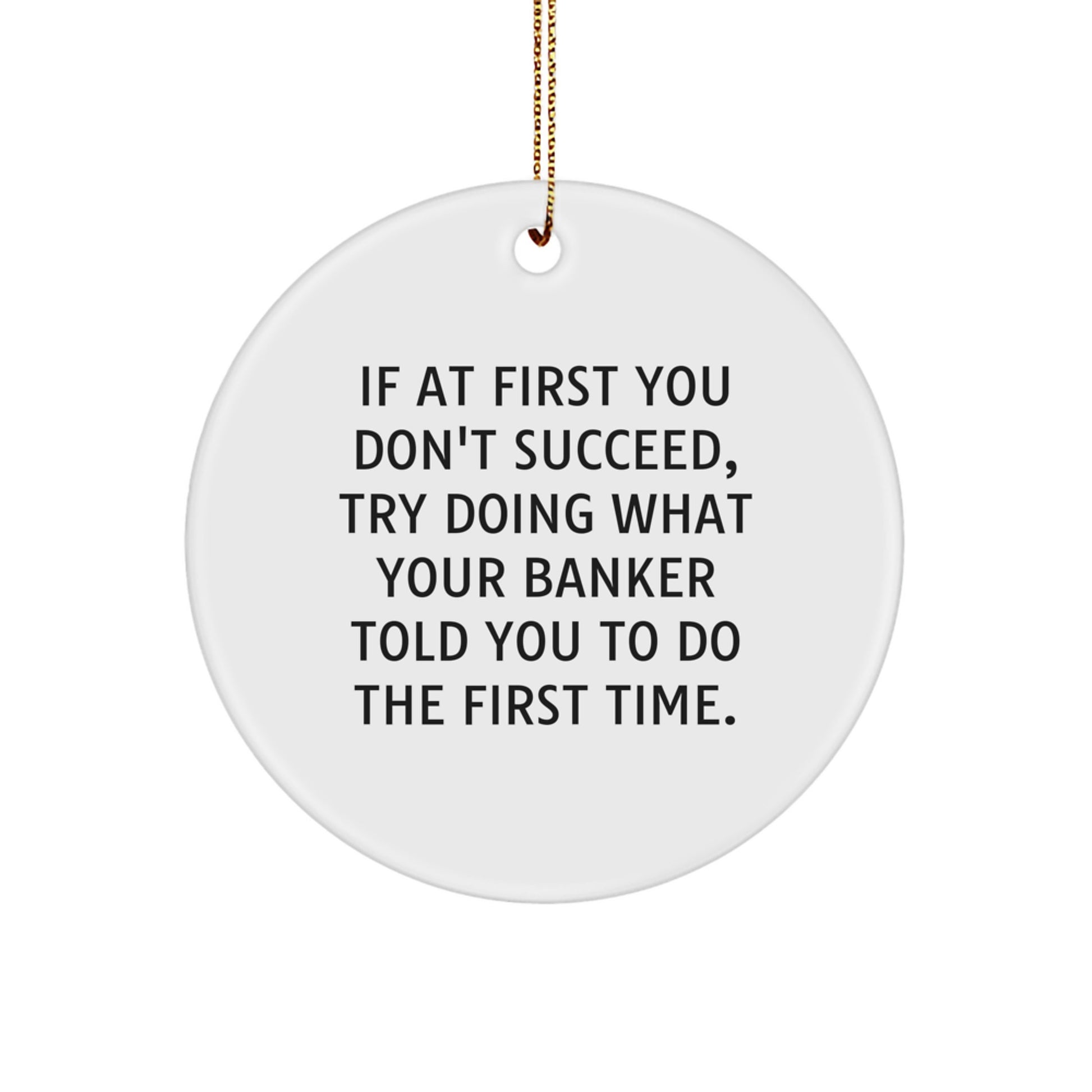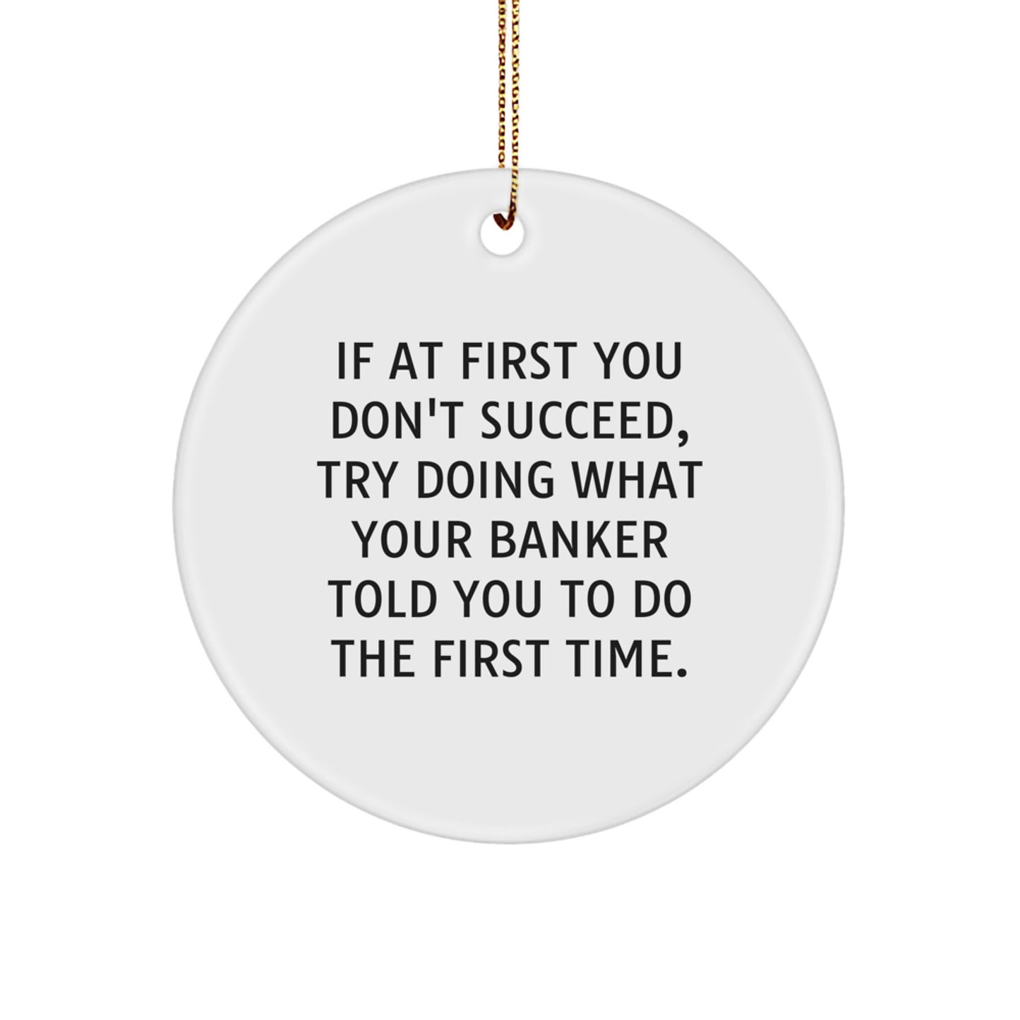- The funny quote 'If at first you don't succeed, try doing what your banker told you to do the first time' is a humorous way to poke fun at the finance industry. This funny banker circle ornament is a great way to add some humor and personality to any room or office.